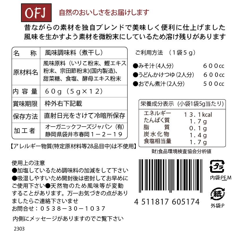 ●伝統的な素材に加えシンプルな原材料で構成されており、毎日のお料理に飽きのこない味わいを作り出し、お料理をさらに美味しく引き立てます。おでん、お味噌汁、うどんだし、豚汁など様々なお料理に活用していただけます。